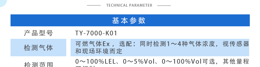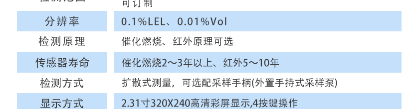 0~100%LEL、0~5%Vol、0~100%Vol可選,其他量程可訂制 |