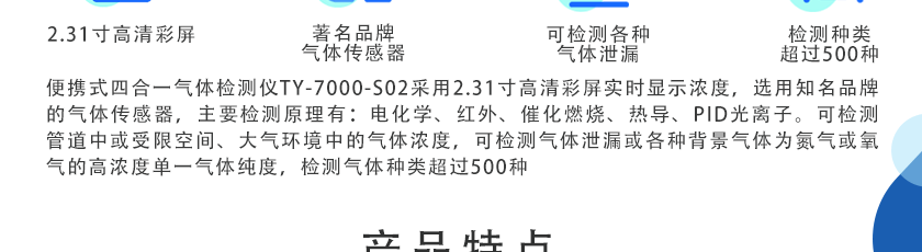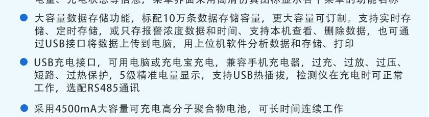 CO(0~1000ppm)、H2S(0~100ppm)、O2(0~30%Vol)、Ex(0~LEL)、CO2(0~5000ppm)、NOX(0~1000ppm),其他量程可訂制 |