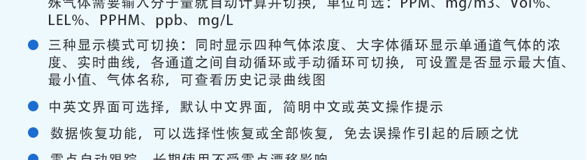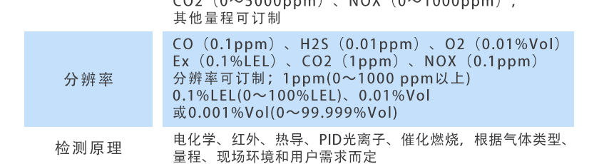 CO(0.1ppm)、H2S(0.01ppm)、O2(0.01%Vol)、Ex(0.1%LEL)、CO2(1ppm)、NOX(0.1ppm),分辨率可訂制:1ppm(0~1000 ppm以上),0.1%LEL(0~100%LEL)、0.01%Vol或0.001%Vol(0~99.999%Vol) |