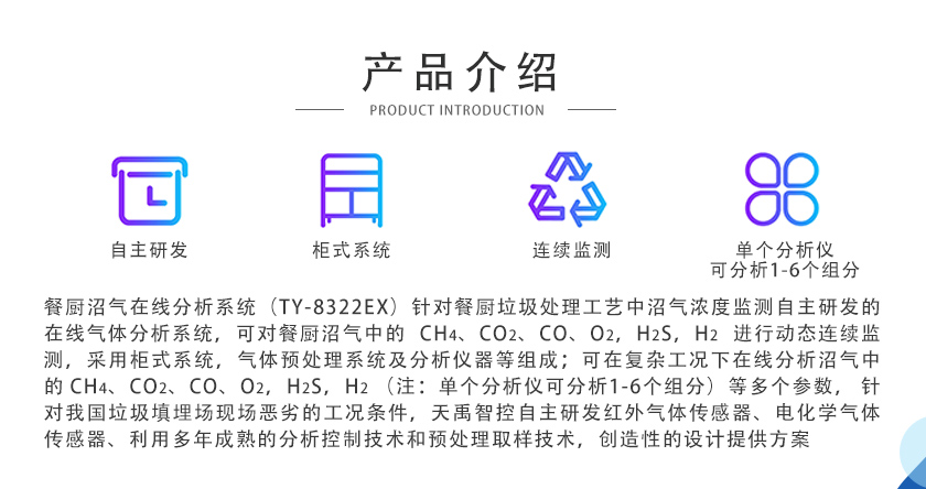 在線紅外餐廚沼氣分析儀TY-6322采用國際最先進的NDIR非分光紅外技術和ECD電化學技術,主要用于測量餐廚垃圾處理工藝和實驗中的沼氣、生物燃氣中的CO、CO2、CH4、H2、O2、H2S等六種氣體體積濃度和熱值。