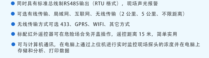 ①電纜傳輸:3芯、4芯電纜線,遠距離傳輸(1-2公里)②GPRS傳輸:可內置GPRS模塊,實時遠程傳輸數據,不受距離限制(選配)③無線傳輸:支持433Mhz,無線電臺傳輸模式,傳輸距離2-10Km,不同功率而定(選配) |