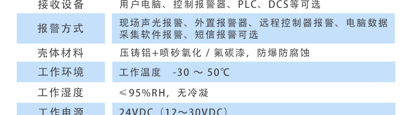現場聲光報警、外置報警器、遠程控制器報警、電腦數據采集軟件報警、短信報警可選 |
