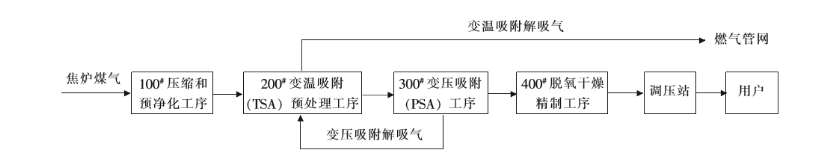 經過壓縮的焦爐煤氣首先通過變溫吸附工藝除去C5以上烴類及萘和微量高沸點雜質,達到凈化焦爐煤氣的目的,然后再經過變壓吸附工藝除去氧以外的所有雜質,得到99.9%以上純度的氫氣,再通過催化反應除去氧,使氧含量≤2ppm,并經干燥制得純度為99.999%以上,露點≤-60℃的產品氫氣。整個工藝過程分為4個工序,如下圖。