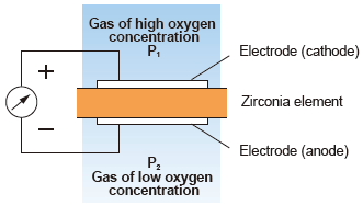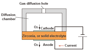如果氧氣通過隔膜溶解在陽極(賤金屬)和陰極(貴金屬)彼此相鄰的電解液中,則產生與溶解氧量成比例的電流。通過隔膜的氧氣量與樣品氣體的氧氣分壓成比例,因此,氧氣濃度可以通過測量電流來確定。