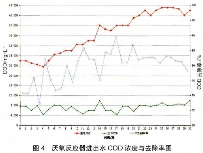 從圖4可以看出,在25?27周,厭氧反應器進水COD值最高為46000mg/L左右,出水C0D在8000?9000mg/L內波動,COD去除率為80.4% ~82.6%。厭氧反應器出水中VFA濃度為2000~3000mg/L,較高的VFA有助于后續的好氧生物處理。