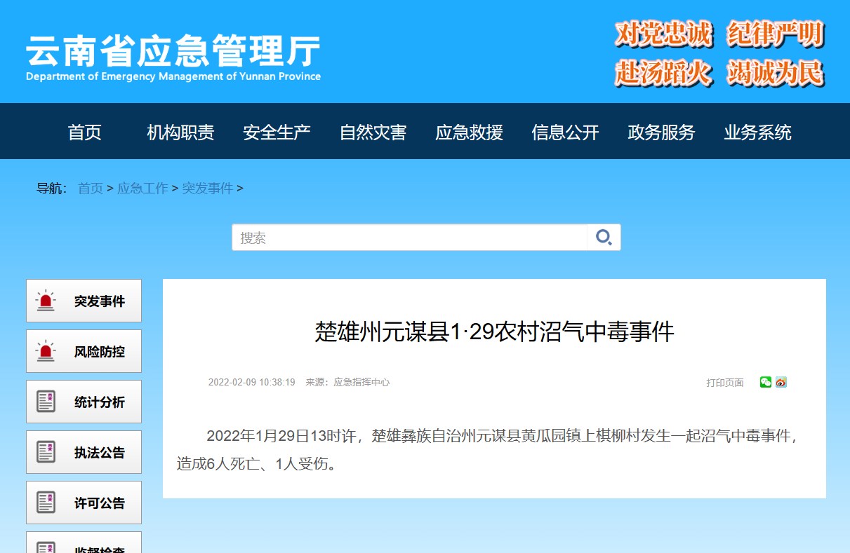 2月9日,云南省應急管理廳通報了“楚雄州元謀縣1·29農(nóng)村沼氣中毒事件”。
