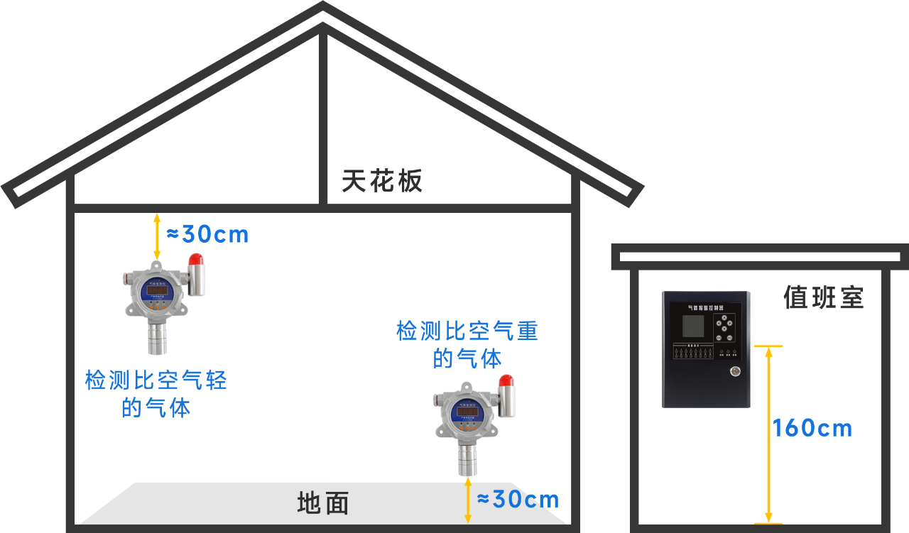 2.檢測可燃氣體比重小于空氣時,可燃氣體檢測儀安裝位置應該在疑似泄漏點上方,距離天花板不大于30-60cm,檢測可燃氣體比重大于空氣時,可燃氣體檢測儀安裝位置應該在疑似泄漏點下方30-60cm,距離地面不大于30cm;