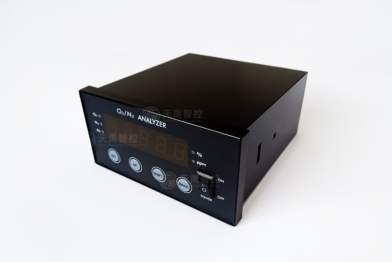 天禹智控的O2/N2分析儀,采用基于氧化鋯(Zirconia)技術的傳感器,它們能在ppm等級實現出色的精度,具備快速反應時間和長壽命、無損耗等優勢。采用RS485通訊,允許執行遠程校準和獲取測量數據。經過高性能32單位片機對信號進行處理換算,直接計算出氮氧混合氣體中的氧氣濃度值,經由數碼管顯示氧氣濃度值或經推算出的氮氣濃度值。
