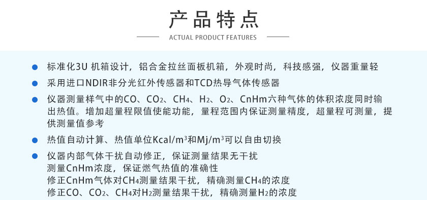(3)儀器測量樣氣中的CO、CO2、CH4、H2、O2、CnHm六種氣體的體積濃度同時輸出熱值。增加超量程限值使能功能,量程范圍內保證測量精度,超量程可測量,提供測量值參考