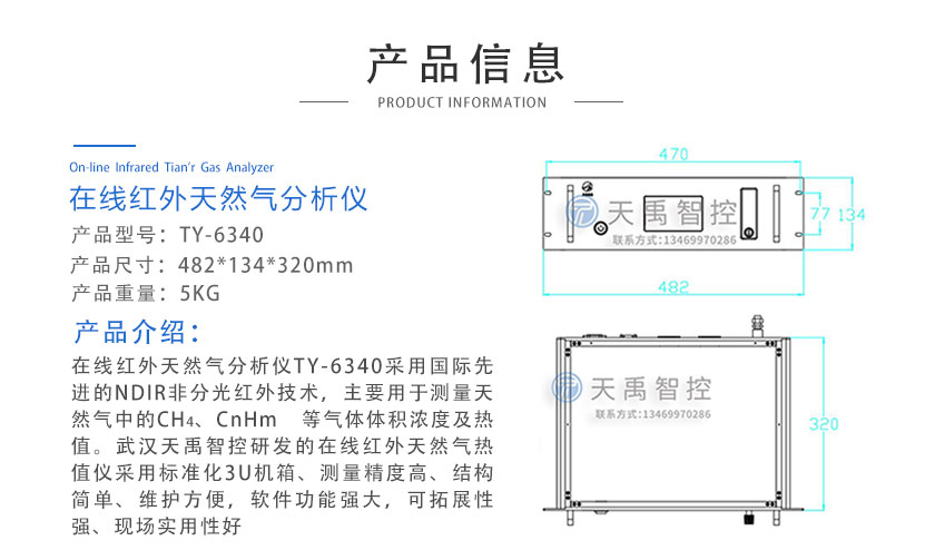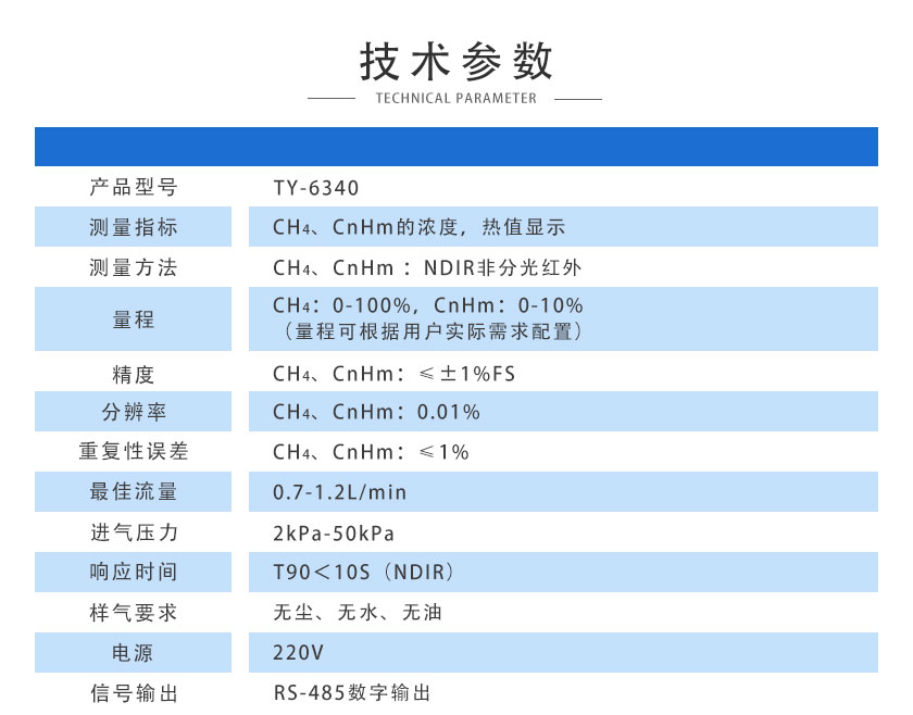 • 在線紅外天然氣分析儀 TY-6340 在線紅外天然氣分析儀TY-6340采用自主知識產權的NDIR非分光紅外技術,主要用于測量天然氣中的CH4、CnHm?等氣體體積濃度及熱值。武漢天禹智控研發的在線紅外天然氣熱值儀采用標準化3U機箱、測量精度高、結構簡單、維護方便,軟件功能強大,可拓展性強、現場實用性好。目前廣泛應用于燃氣具生產企業、廠商,燃氣計量檢測部門、節能監測部門,科研、環保和配氣等行業,天然氣公司,液化氣廠、液化氣站等領域,測量天然氣中不同成分的體積濃度和熱值。