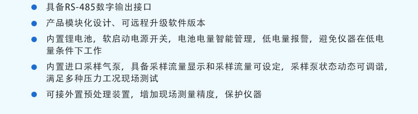 17)內置進口采樣氣泵,具備采樣流量顯示和采樣流量可設定,采樣泵狀態動態可調諧,滿足多種壓力工況現場測試。